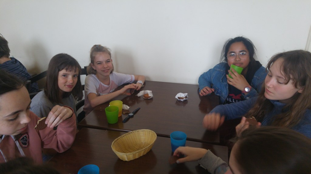 Puis pendant que les filles se lavaient, les garçons jouaient, certains faisaient du piano avec Mme Pitte ou des jeux de sociétés avec Mme Bénard. Ensuite ce fut le tour des garçons de se laver… C’est pendant ce temps que nous écrivons ce blog.
