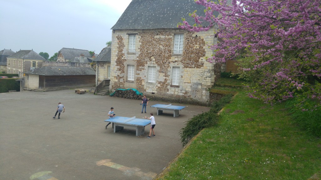 Ici, les pièces sont très grandes en hauteur comme en largeur. On s’y perd facilement mais pour vous rassurer, on n’a perdu personne. De la fenêtre de nos chambres, nous voyons la Loire. Contrairement à la Seine, il y a des bancs de sable un peu partout. Au Thoureil, c’est assez riche, il y a beaucoup de châteaux et de belles maisons faites en pierres blanches.