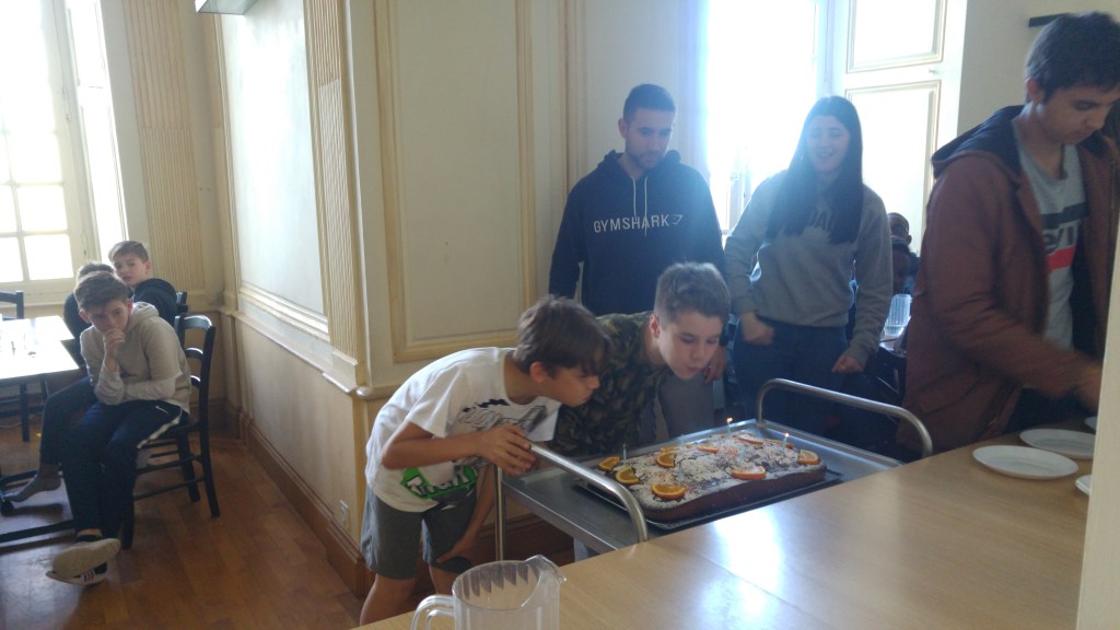 Ce soir nous avons fêté les anniversaires de Julien et Mahaut qui ont eu 13 ans cette semaine. Nous avons mangé un bon gâteau!